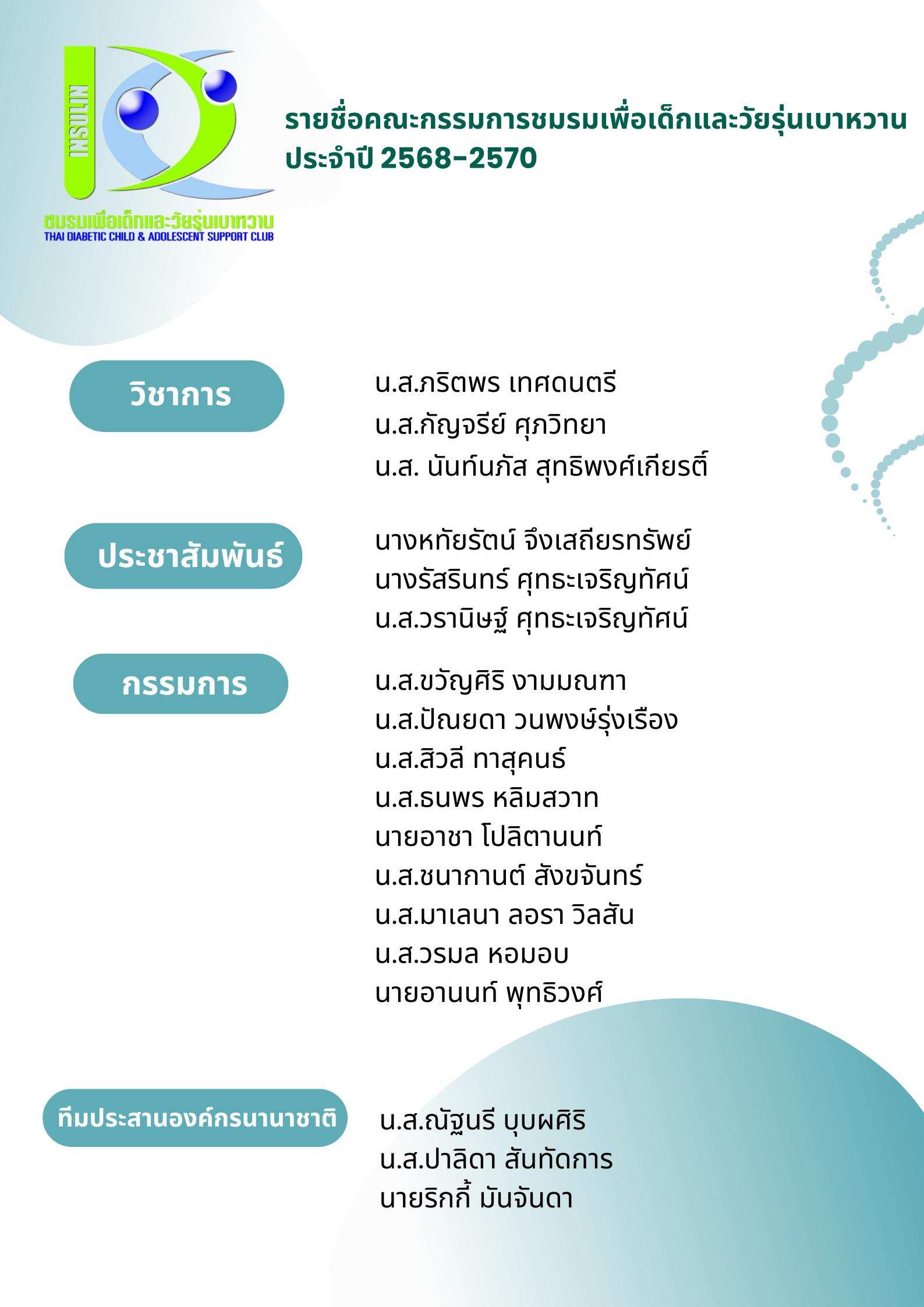 ตามที่คณะกรรมการชมรมเพื่อเด็กและวัยรุ่นเบาหวานชุดเดิมประจำปี 2561-2563 (ดำเนินงานจนถึงปี 2567) หมดวาระ ในการประชุมคณะกรรมการชมรมฯ เมื่อวันที่ 19 มกราคม 2568 จึงมีการพิจารณาทบทวนรายชื่อที่ปรึกษาและแต่งตั้งคณะกรรมการชมรมฯ ชุดใหม่ ปี 2568-2570 (ระยะเวลา 3 ปี) และเริ่มดำเนินงานตามวัตถุประสงค์ของชมรมตั้งแต่บัดนี้เป็นต้นไป